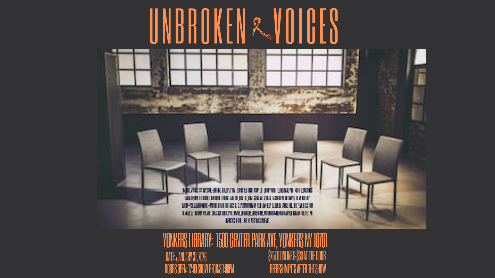 Unbroken Voices is a raw, soul-stirring stage play that brings you inside a support group where people living with Multiple Sclerosis learn to speak their truth, out loud. Through laughter, conflict, confession, and courage, each character reveals the weight they carry—visible and invisible—and the strength it takes to keep standing when your own body becomes a battlefield. This powerful story reminds us that even when life breaks us in unexpected ways, our voices, our stories, and our community can piece us back together. No one fights alone… and no voice goes unheard.